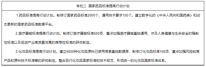 1.持續(xù)推進(jìn)標(biāo)準(zhǔn)體系建設(shè)。繼續(xù)開展國(guó)家藥品標(biāo)準(zhǔn)提高行動(dòng)計(jì)劃。編制2025年版《中華人民共和國(guó)藥典》。加強(qiáng)標(biāo)準(zhǔn)的國(guó)際協(xié)調(diào),牽頭中藥國(guó)際標(biāo)準(zhǔn)制定,化學(xué)藥品標(biāo)準(zhǔn)達(dá)到國(guó)際先進(jìn)水平,生物制品標(biāo)準(zhǔn)與國(guó)際水平保持同步,藥用輔料和藥包材標(biāo)準(zhǔn)緊跟國(guó)際標(biāo)準(zhǔn)。加強(qiáng)藥品標(biāo)準(zhǔn)技術(shù)支撐體系建設(shè),提升藥品標(biāo)準(zhǔn)研究能力。優(yōu)化醫(yī)療器械標(biāo)準(zhǔn)體系,鼓勵(lì)新興技術(shù)領(lǐng)域推薦性標(biāo)準(zhǔn)制定,加快與國(guó)際標(biāo)準(zhǔn)同步立項(xiàng),提升國(guó)內(nèi)外標(biāo)準(zhǔn)一致性。完善化妝品標(biāo)準(zhǔn)技術(shù)支撐體系,健全標(biāo)準(zhǔn)制修訂工作機(jī)制。