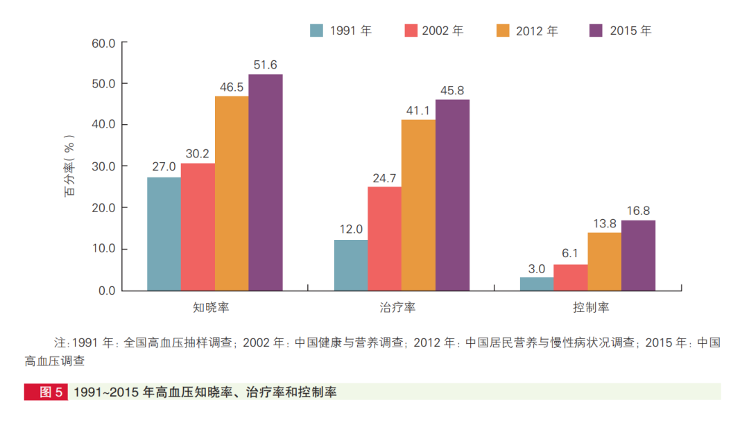 近年來,高血壓的知曉率、治療率和控制率呈現(xiàn)出持續(xù)增長(zhǎng)趨勢(shì)。知曉率從1991年的27%升至2015年的51.6%,同期治療率從12.0%升至45.8%,控制率從3.0%升至16.8%。